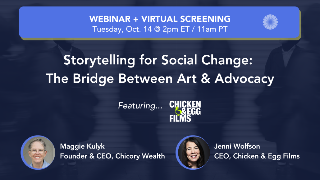 Join us for part 3 of our “Chicory 1% for Social Justice” webinar series, featuring Chicken & Egg Films CEO, Jenni Wolfson in discussion with Maggie Kulyk, CEO of Chicory Wealth.